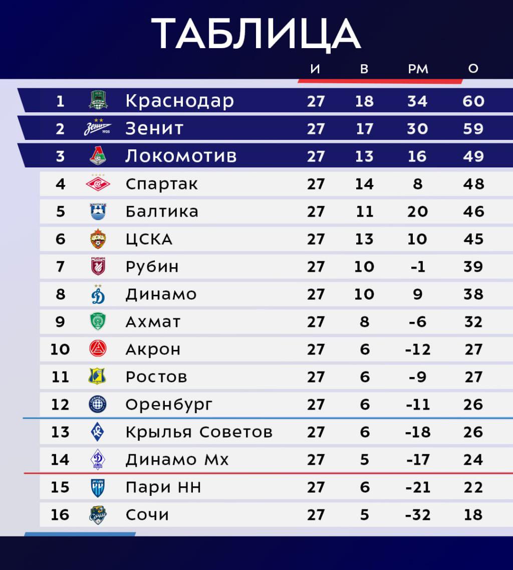 После 27 матчей лидерство сохранил «Краснодар» (60 очков), вторым идет петербургский «Зенит» (59). На третью строчку с 49 очками сохранил «Локомотив». Вплотную к железнодорожникам приблизился московский «Спартак» (48), который сместил с пятого места «Балтику» (46).